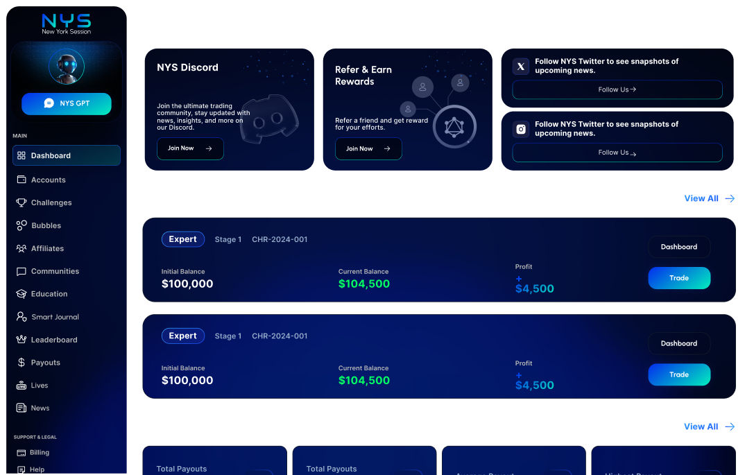 Advanced dashboards, smart journaling, analytics, and payout tracking — all in one place. One place for challenges, analytics, payouts, and community